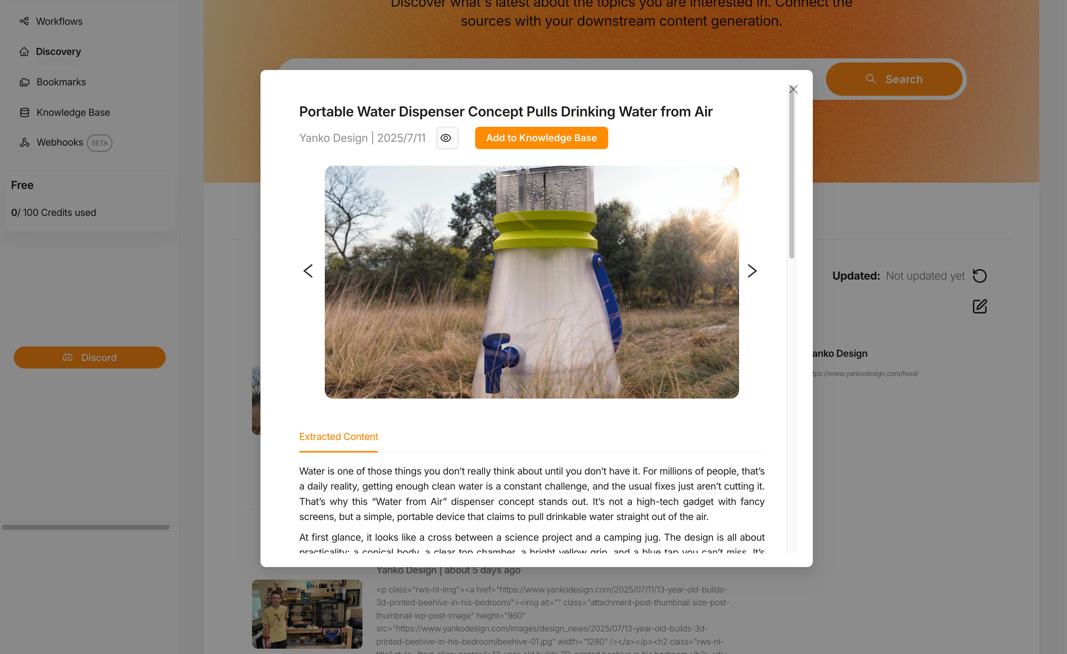 Once new content is loaded, you can review the items and save the ones you find relevant directly to your Knowledge Base.